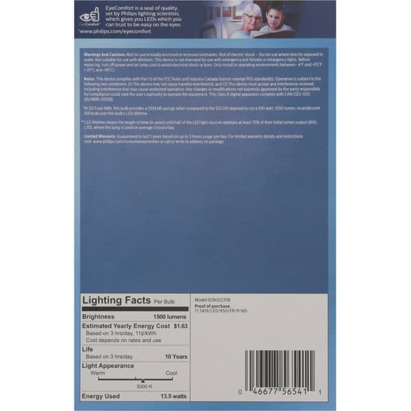Model Number: 9290023118 Brightness Quantity: 1500 lumens. Energy Info: $1.63 based on 3 hrs/day, 11 cents/kWh. Cost depends on rates and use 13.5 watts. Package Info: 4-Pack. 4. Bulb Info: LED. Medium. Bulb Life: 10 years based on 3 hrs/day Bulb Appearance: 5000 k.