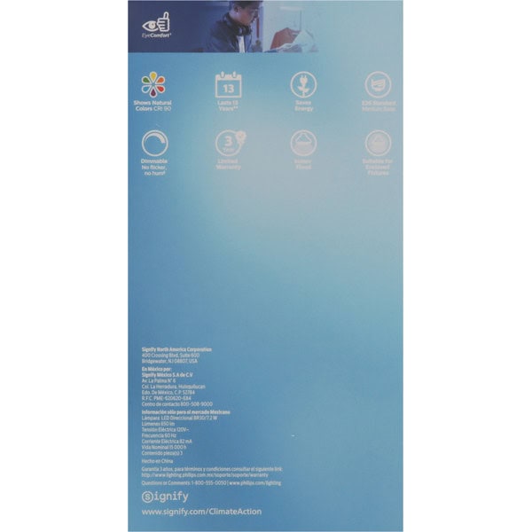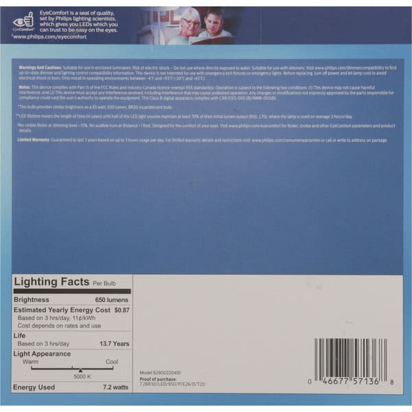 Model Number: 9290022041D Brightness Quantity: 650 lumens. Energy Info: $0.87 Based on 3 hrs/day, 11 cents/kWh. Cost depends on rates and use. 7.2 watts. Package Info: 3. Bulb Info: LED. Is Dimmable. Screw. Medium. Bulb Life: 13.7 years Based on 3 hrs/day. Bulb Appearance: 5000 K .
