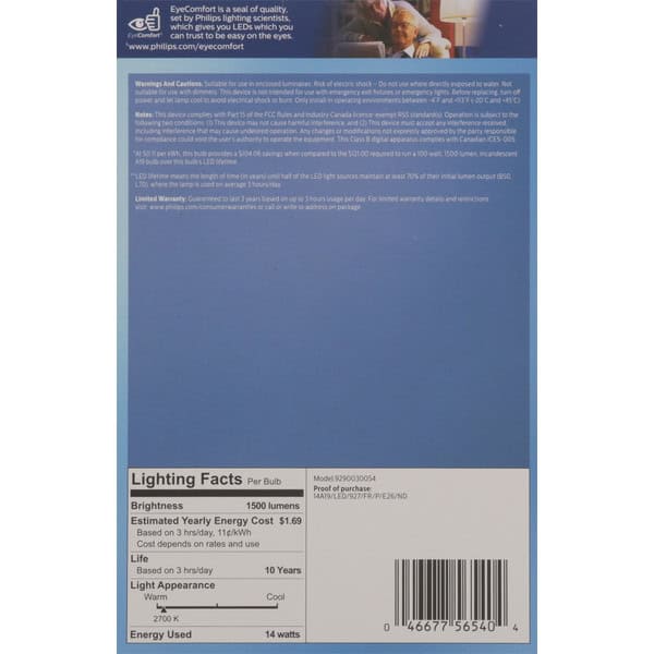 Model Number: 9290030054 Brightness Quantity: 1500 lumens. Energy Info: $1.69 based on 3 hrs/day, 11¢/kWh. Cost depends on rates and use. 14 watts. Package Info: 4-Pack. 4. Bulb Info: LED. Screw. Bulb Life: 10 years based on 3 hrs/day. Bulb Appearance: 2700 k.