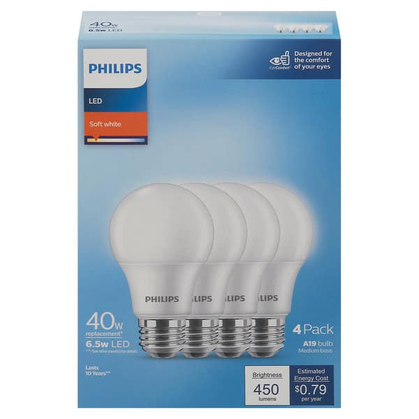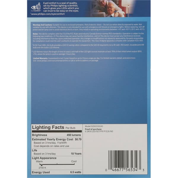 Model Number: Model: 9290030045 Brightness Quantity: 450 lumens. Energy Info: $0.79 Based on 3 hrs/day, 11 ¢/kWh. Cost depends on rates and use. 6.5 watts. Package Info: 4-Pack. 4. Voltage: 40 w. Bulb Info: LED. Screw. Medium. Bulb Life: 10 years Based on 3 hrs/day. Bulb Appearance: 2700 k.