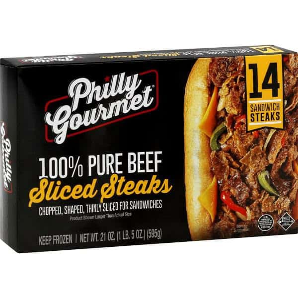 Cooking Instructions: Cook frozen. Preheat fry pan to 350 degrees F (medium-high). Add Philly Gourmet sliced steaks and cook for approximately one minute. Turn steaks and cook other side for 15-20 seconds until no pink is showing. Philly Gourmet sliced steaks should be brown on both sides. The above Nutrition Facts are for the product as consumed, one cooked portion, and are based upon the following cooking instructions: Place frozen steak on 350 degrees F griddle or in frying pan on medium heat for approximately one minute on one side, and about 15-20 seconds on the other side. Caution: Frozen foods can cause spattering when added to hot pan. Add product carefully.