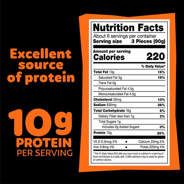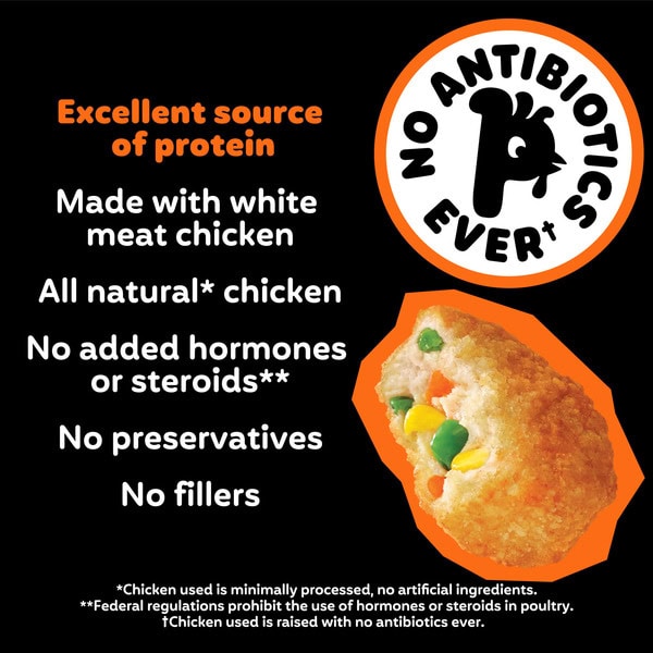 1. Preheat oven to 425°F. 2. Place frozen chicken pieces on a baking sheet coated with non-stick cooking spray. 3. Bake uncovered for 20 minutes. Flip pieces over halfway through heating. 4. Insert a meat thermometer into the thickest portion of the product. Continue heating until the internal temperature reaches 165°F.