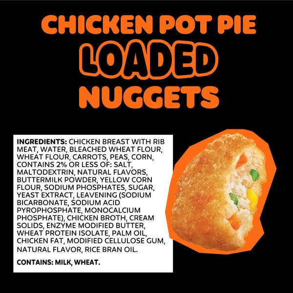 Chicken Breast With Rib Meat, Water, Bleached Wheat Flour, Wheat Flour, Carrots, Peas, Corn, Contains 2% Or Less Of: Salt, Maltodextrin, Natural Flavors, Buttermilk Powder, Yellow Corn Flour, Sodium Phosphates, Sugar, Yeast Extract, Leavening (sodium Bicarbonate, Sodium Acid Pyrophosphate, Monocalcium Phosphate), Chicken Broth, Cream Solids, Enzyme Modified Butter, Wheat Protein Isolate, Palm Oil, Chicken Fat, Modified Cellulose Gum, Natural Flavor, Rice Bran Oil