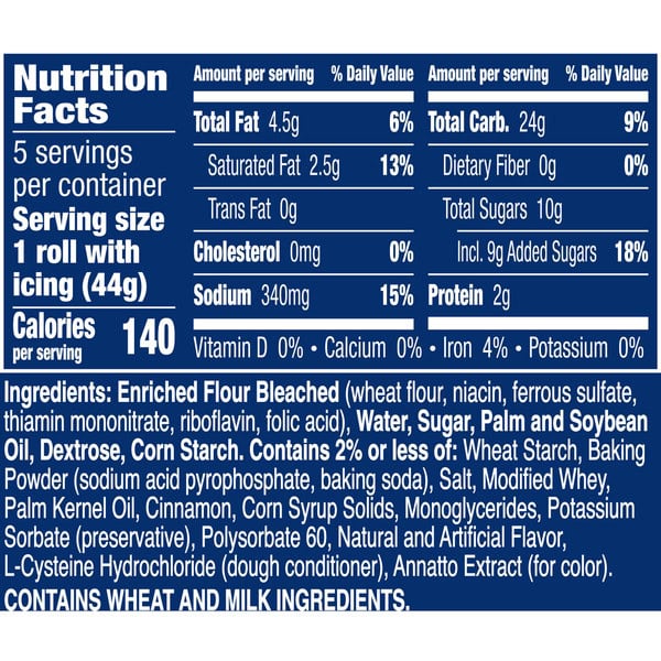 Enriched Flour Bleached (wheat Flour, Niacin, Ferrous Sulfate, Thiamin Mononitrate, Riboflavin, Folic Acid), Water, Sugar, Palm And Soybean Oil, Dextrose, Wheat Starch, Contains 2% Or Less Of: Baking Powder (sodium Acid Pyrophosphate, Baking Soda), Palm Kernel Oil, Salt, Modified Whey, Corn Syrup Solids, Cinnamon, Monoglycerides, Xanthan Gum, Potassium Sorbate (preservative), Polysorbate 60, Corn Starch, Natural And Artificial Flavor, Annatto Extract (for Color)