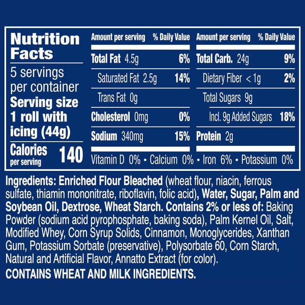 Enriched Flour Bleached (wheat Flour, Niacin, Ferrous Sulfate, Thiamin Mononitrate, Riboflavin, Folic Acid), Water, Sugar, Palm And Soybean Oil, Dextrose. Contains 2% Or Less Of: Baking Powder (sodium Acid Pyrophosphate, Baking Soda), Palm Kernel Oil, Salt, Modified Whey, Cinnamon, Wheat Starch, Corn Syrup Solids, Monoglycerides, Corn Starch, Xanthan Gum, Potassium Sorbate (preservative), Polysorbate 60, Natural And Artificial Flavor, Annatto Extract (for Color).