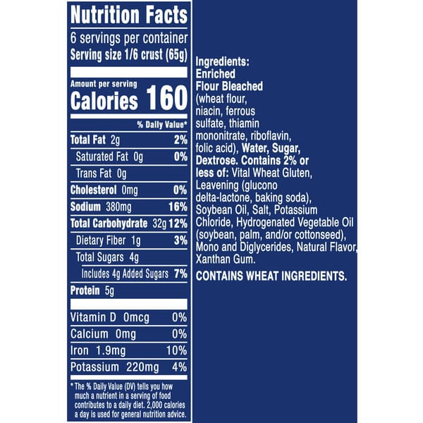 Enriched Flour Bleached (wheat Flour, Niacin, Ferrous Sulfate, Thiamin Mononitrate, Riboflavin, Folic Acid), Water, Sugar, Dextrose. Contains 2% Or Less Of: Vital Wheat Gluten, Leavening (glucono Delta-lactone, Baking Soda), Soybean Oil, Salt, Potassium Chloride, Hydrogenated Vegetable Oil (soybean, Palm, And/or Cottonseed), Mono And Diglycerides, Natural Flavor, Xanthan Gum.