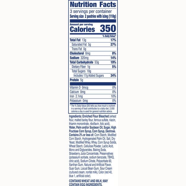 Enriched Flour Bleached (wheat Flour, Malted Barley Flour, Ferrous Sulfate, Niacin, Thiamin Mononitrate, Riboflavin, Folic Acid), Water, Palm And Soybean Oil, Sugar, High Fructose Corn Syrup, Corn Syrup, Contains 2% Or Less Of: Corn Starch, Whey, Modified Corn Starch, Dextrose, Salt, Hydrogenated Palm Oil, Dry Yeast, Corn Syrup Solids, Cellulose Powder, Lactic Acid, Mono And Diglycerides, Baking Soda, Preservatives (potassium Sorbate, Sodium Benzoate, Tbhq, Citric Acid), Strawberry Juice Concentrate, Carboxymethylcellulose, Sodium Citrate, Microcrystalline Cellulose, Polysorbate 60, Gum Arabic, Xanthan Gum, Natural And Artificial Flavor, Sour Cream (cultured Cream, Nonfat Milk), Maltodextrin, Color (red 40, Blue 1, Artificial Color), Coconut Oil