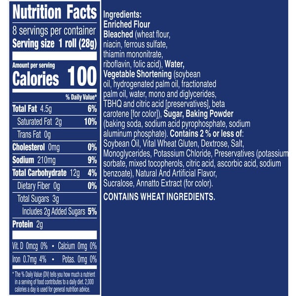 Enriched Flour Bleached (wheat Flour, Niacin, Ferrous Sulfate, Thiamin Mononitrate, Riboflavin, Folic Acid), Water, Vegetable Shortening (soybean And Palm Oil, Hydrogenated Palm Oil, Fractionated Palm Oil, Water, Mono And Diglycerides, Tbhq And Citric Acid [preservatives], Beta Carotene (for Color]), Sugar, Baking Powder (baking Soda, Sodium Acid Pyrophosphate, Sodium Aluminum Phosphate). Contains 2% Or Less Of: Vital Wheat Gluten, Dextrose, Salt, Monoglycerides, Potassium Chloride, Natural Flavor, Sucralose, Yeast Extract, Annatto Extract (for Color).