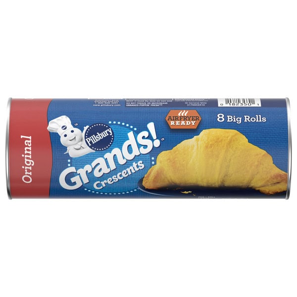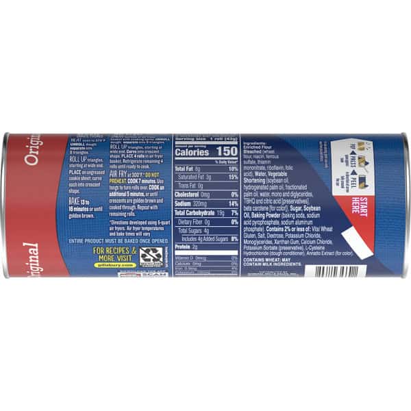 Oven Directions: Heat oven to 375 degrees F. Unroll dough; separate inti 8 triangles. Roll up triangles, starting at wide end. Place on ungreased cookie sheet; curve each into crescent shape. Bake 13 to 16 minutes or until golden brown. Air Fryer Directions: Sprat bottom of air fryer basket with cooking spray. Unroll dough; separate into 8 triangles. Roll up triangles. starting at wide end. Curve into crescent shape. Place 4 rolls in air fryer basket. Refrigerate remaining 4 rolls until ready to cook. Air fry at 300 degrees F. (Directions developed using 6 – quart air fryers. Air fryer temperatures and bake times will vary) Do not preheat. Cook 7 minutes. Use tongs to turn rolls over. Cook an additional 5 minutes, or until crescents are golden brown and cooked through. Repeat with remaining rolls. Entire product must be baked once opened.