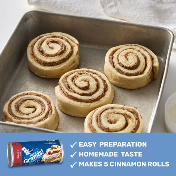 Slow down and savor the morning together with warm, freshly-baked Pillsbury Flaky Grands! Cinnamon Rolls. It’s easy to make any day cinnamony sweet with Pillsbury’s ready-to-bake flaky dough made with Cinnabon cinnamon and premade Original icing. These refrigerated cinnamon rolls make a great weekday breakfast or special holiday treat. Ready in minutes, these deluxe cinnamon rolls will quickly become a family favorite. Imagine the memories you’ll make.