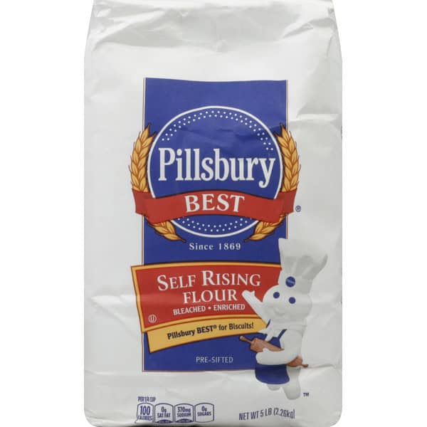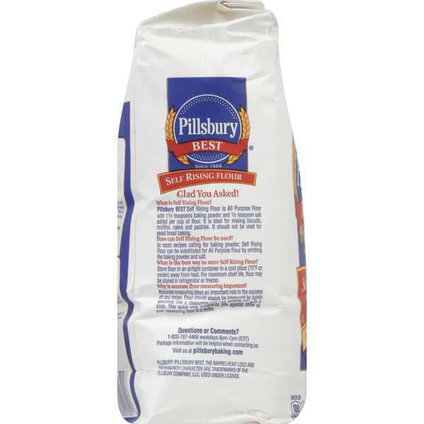 Since 1869. Pre-sifted. Pillsbury Best for biscuits! Per 1/4 Cup: 100 calories; 0 g sat fat (0% DV); 370 mg sodium (16% DV); 0 g sugars. Glad You Asked! What is Self Rising Flour? Pillsbury Best Self Rising Flour is All Purpose Flour with 1-1/2 teaspoons baking powder and 1/2 teaspoon salt added per cup of flour. It is ideal for making biscuits, muffins, cakes and pastries. It should not be used for yeast bread baking. How Can Self Rising Flour Be Used? In most recipes calling for baking powder, Self Rising Flour can be substituted for All Purpose Flour by omitting the baking powder and salt. Questions or Comments? 1-800-767-4466 weekdays 9am-7pm (EST). Package information will be helpful when contacting us. Visit us at pillsburybaking.com. 100 calories per 1/4 cup.