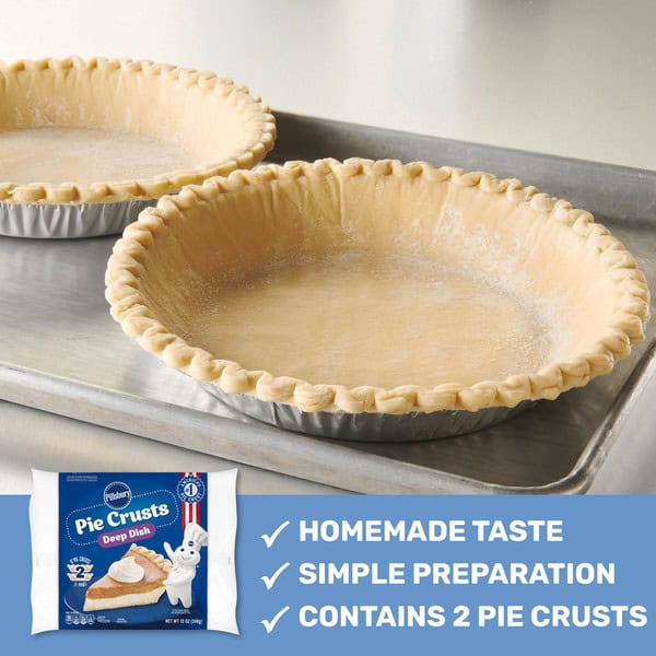 • CONTAINS: Two pieces of Pillsbury Frozen Pie Crust, Deep Dish, 9-Inch Pie Crusts and Pans, 12 oz