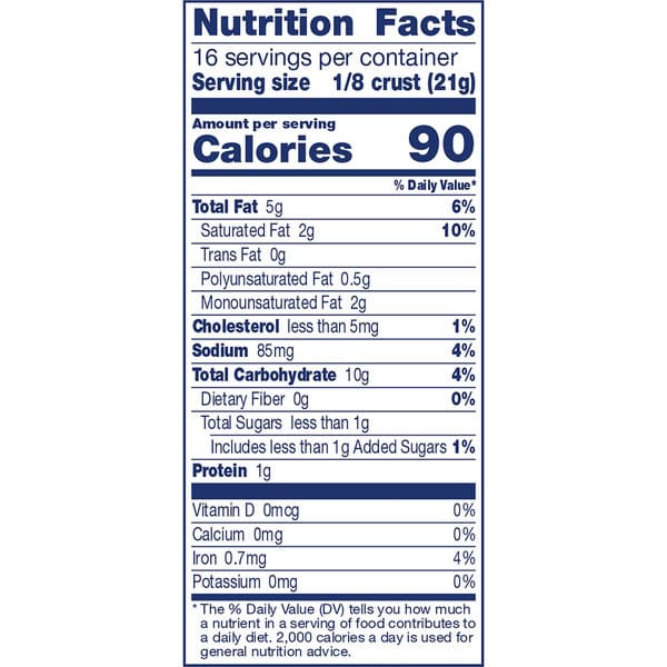 Pillsbury Deep Dish Frozen Pie Crusts bring a deeply delicious taste and convenience to your kitchen! These crusts are ready to fill and can be used for one-crust or two-crust pies. No measuring or mixing – simply follow the instructions to go from freezer to oven. Perfect for gatherings and events, these baking must-haves are great for chiffon or cream pies, apple, pecan, and pumpkin pies, plus savory dishes like a pot pie or quiche. Treat friends and family to something truly delicious with this easy pie dough crust. At Pillsbury, we strive to make home baked moments extra special through our products and recipes, which help make cooking and baking easy and convenient for even the busiest families. Contains Two pieces of Pillsbury Frozen Pie Crust, Deep Dish, 9-Inch Pie Crusts and Pans, 12 oz.
