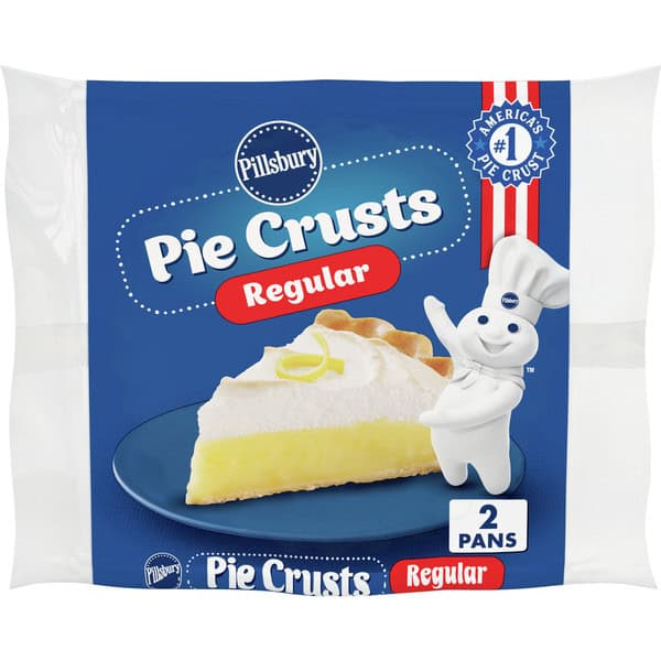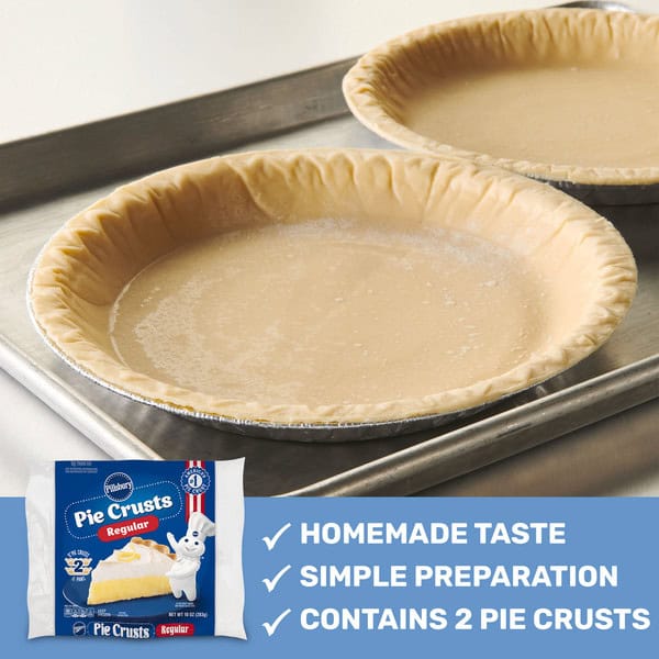 Pillsbury Regular Frozen Pie Crusts bring a delicious taste and convenience to your kitchen! These crusts are ready to fill and can be used for one-crust or two-crust pies. No measuring or mixing – simply follow the instructions to go from freezer to oven. Perfect for gatherings and events, these baking must-haves are great for fruit pies, pecan and pumpkin pies, and savory dishes like a pot pie or quiche. Treat friends and family to something truly delicious with this easy pie dough crust. At Pillsbury, we strive to make home baked moments extra special through our products and recipes, which help make cooking and baking easy and convenient for even the busiest families. Contains Two pieces of Pillsbury Frozen Pie Crust, Regular, Two 9-Inch Pie Crusts and Pans, 10 oz.