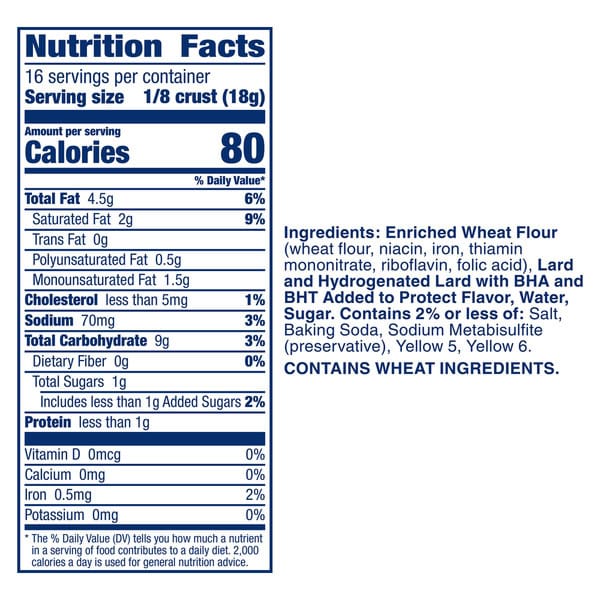 Enriched Wheat Flour (wheat Flour, Niacin, Iron, Thiamin Mononitrate, Riboflavin, Folic Acid), Lard And Hydrogenated Lard With Bha And Bht Added To Protect Flavor, Water, Sugar, Contains 2% Or Less Of: Salt, Baking Soda, Sodium Metabisulfite (preservative), Yellow 5, Yellow 6