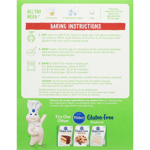 All You Need (Ensure all recipe ingredients are gluten free by referencing the ingredient labels, as product may vary. If uncertain, contact the ingredient manufacturer): 1/3 cup oil; 3 tablespoon water; 1 egg. If desired, substitute 1/2 cup gluten-free egg substitute for the eggs. Baking Instructions: 1. Set oven to 350 degrees F for metal or glass pan. For dark coated pan, set oven to 325 degrees F. Coat bottom of 8 x 8 or 9 x 9-inch pan with gluten-free no-stick cooking spray. 2. Beat water, oil and egg in a medium bowl until fully blended. Add brownie mix and stir until blended, about 50 strokes. Spread into prepared pan. 3. Bake at 350 degrees F for metal or glass pan. For dark coated pan, bake at 325 degrees F. For 8 x 8-inch pan, 31 to 34 minutes (Directions developed using conventional ovens. Ovens vary; baking time may need to be adjusted). For 9 x 9-inch pan, 28 to 31 minutes (Directions developed using conventional ovens. Ovens vary; baking time may need to be adjusted). Cut and serve when completely cooled. Store loosely covered. Warning: Do not eat raw batter. Please cook fully before enjoying. Double Batch: Coat bottom of 13 x 9-inch baking pan. Combine 2 packages brownie mix, 2/3 cup oil, 1/3 cup water and 2 eggs; mix as directed above. Bake at 350 degrees for 31 to 34 minutes (Directions developed using conventional ovens. Ovens vary; baking time may need to be adjusted).