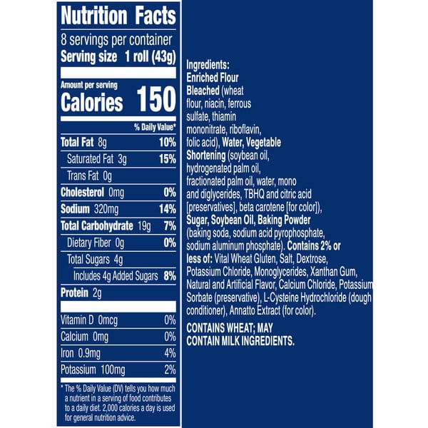 Enriched Flour Bleached (wheat Flour, Niacin, Ferrous Sulfate, Thiamin Mononitrate, Riboflavin, Folic Acid), Water, Vegetable Shortening (soybean And Palm Oil, Hydrogenated Palm Oil, Fractionated Palm Oil, Water, Mono And Diglycerides, Tbhq And Citric Acid [preservatives], Beta Carotene [for Color]), Sugar, Soybean Oil, Baking Powder (baking Soda, Sodium Acid Pyrophosphate, Sodium Aluminum Phosphate), Contains 2% Or Less Of: Vital Wheat Gluten, Salt, Dextrose, Potassium Chloride, Monoglycerides, Artificial Flavor, Xantha Gum, Alpha Tocopherol (preservative), Annato Extract (for Color)