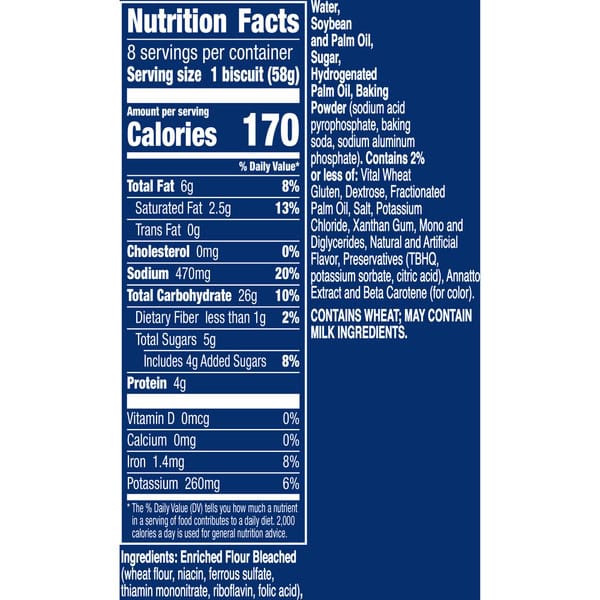 Enriched Flour Bleached (wheat Flour, Niacin, Ferrous Sulfate, Thiamin Mononitrate, Riboflavin, Folic Acid), Water, Soybean And Palm Oil, Sugar, Hydrogenated Palm Oil, Baking Powder (sodium Acid Pyrophosphate, Baking Soda, Sodium Aluminum Phosphate), Contains 2% Or Less Of: Vital Wheat Gluten, Dextrose, Fractionated Palm Oil, Salt, Potassium Chloride, Xanthan Gum, Mono And Diglycerides, Butter, Preservatives (tbhq, Citric Acid), Natural And Artificial Flavor, Annatto Extract And Beta Carotene (for Color)