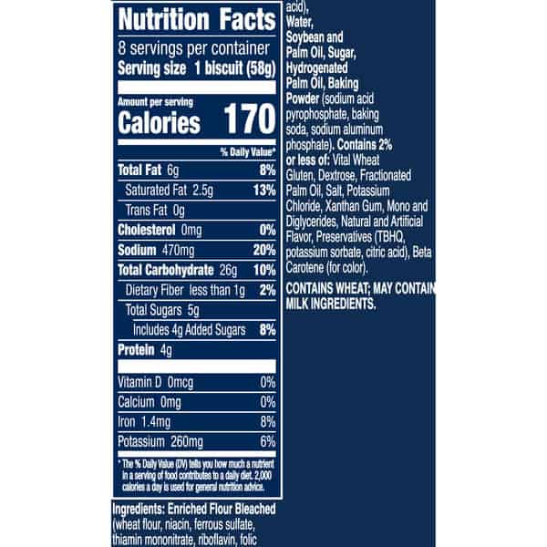 Enriched Flour Bleached (wheat Flour, Niacin, Ferrous Sulfate, Thiamin Mononitrate, Riboflavin, Folic Acid), Water, Soybean And Palm Oil, Sugar, Hydrogenated Palm Oil, Baking Powder (sodium Acid Pyrophosphate, Baking Soda, Sodium Aluminum Phosphate), Contains 2% Or Less Of: Vital Wheat Gluten, Dextrose, Fractionated Palm Oil, Salt, Potassium Chloride, Xanthan Gum, Mono And Diglycerides, Natural And Artificial Flavor, Preservatives (tbhq, Citric Acid), Butter, Beta Carotene (for Color)
