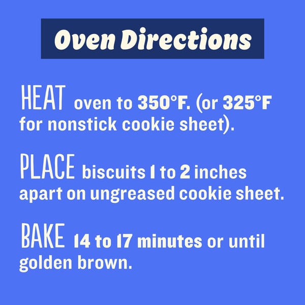 Directions: Heat oven to 350 degrees F (or 325 degrees F for nonstick cookie sheet). Place biscuits 1 to 2 inches apart on ungreased cookie sheet. Bake 14 to 17 minutes or until golden brown.