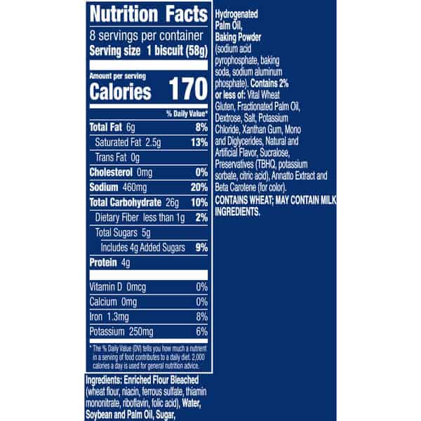 Enriched Flour Bleached (wheat Flour, Niacin, Ferrous Sulfate, Thiamin Mononitrate, Riboflavin, Folic Acid), Water, Soybean And Palm Oil, Sugar, Hydrogenated Palm Oil, Baking Powder (sodium Acid Pyrophosphate, Baking Soda, Sodium Aluminum Phosphate), Contains 2% Or Less Of: Vital Wheat Gluten, Fractionated Palm Oil, Dextrose, Salt, Potassium Chloride, Xanthan Gum, Mono And Diglycerides, Natural And Artificial Flavor, Sucralose, Butter, Preservatives (tbhq, Citric Acid), Annatto Extract And Beta Carotene (for Color)