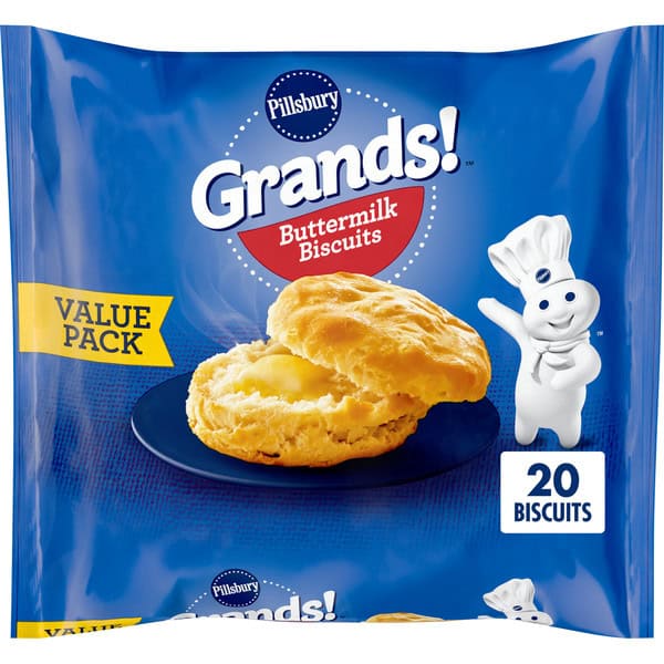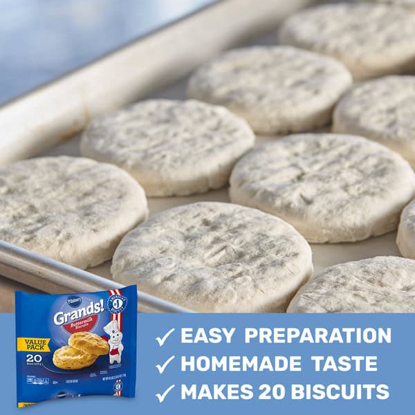 Pillsbury Grands! Buttermilk Breakfast Biscuits Value Pack transforms any breakfast from bland to grand. Simply place on a cookie sheet, bake until golden brown and enjoy warm, fluffy, fresh-from-the-oven biscuits straight out of your freezer. Pillsbury frozen biscuits include no colors from artificial sources or high fructose corn syrup, so you can feel good about serving these biscuits at your next brunch or family gathering. Top with sausage and gravy, build the ultimate breakfast sandwich or serve with butter and honey for the perfect brinner” appetizer. Keep this biscuit dough in your freezer for when you’re ready to cook up some homemade buttermilk flavor. You can even make them in the air fryer.
