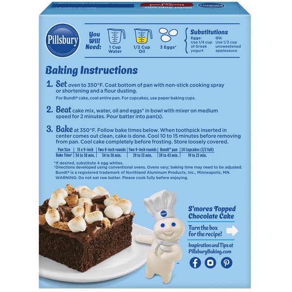 All You Need: 1 cup water 1/2 cup oil 3 eggs(If desired, substitute 4 egg whites or 1/2 cup egg substitute for the eggs.) Substitutions Eggs: Use 1/4 cup of Greek yogurt or Oil: Use 1/2 cup unsweetened applesauce. Baking Instructions: (1) Set oven to 350 degrees F. Coat bottom of pan with no-stick cooking spray or shortening and a flour dusting. For Bundt cake, coat entire pan. For cupcakes, use paper baking cups. (2) Beat cake mix, water, oil and eggs in bowl with mixer on medium speed for 2 minutes. Pour batter into pan(s). (3)Bake at 350 degrees F. Follow the bake times below. When toothpick inserted in the center comes out clean, cake is done. Cool 10 to 15 minutes before removing from pan. Cool cake completely before frosting. Store loosely covered. Pan Size: (13 x 9 – inch), Bake Time (34 to 38 min.); Pan Size: (Two 8 – inch rounds), Bake Time (34 to 38 min.); Pan Size: (Two 9 – inch rounds), Bake Time (29 to 43 min.); Bundt pan: Bake Time (39 to 43 min.) .); Pan Size: (24 Cupcakes (1/2 full), Bake Time (19 to 23 min.).