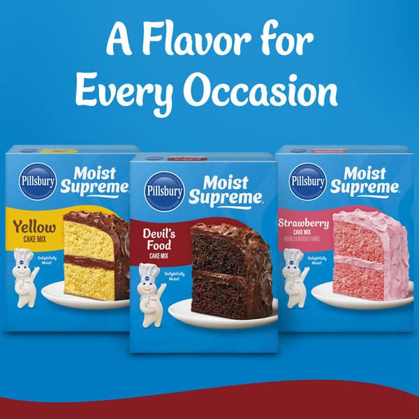Transform everyday moments into fun-filled celebrations with Pillsbury cake mix. With each bite, you’ll experience the beloved flavor that keeps you coming back for more. Pillsbury Moist Supreme Devil’s Food Cake Mix lets you easily prepare a delightful dessert in just three steps. Simply add water, eggs and vegetable oil to the dry mix, then pop it in the oven to make one 13 x 9″ sheet cake or 24 cupcakes. Our box cake mix is ideal for birthdays, holidays, family gatherings and any celebration, big or small. Try using our versatile cake mix to make cake pops, cookies, bundt cakes and other delicious desserts that everyone will enjoy. Use Pillsbury Creamy Supreme Frosting, sprinkles, candy and more to decorate your cake for any occasion. Keep your pantry stocked with our 15.25-ounce box of devil’s food cake mix so you can bake up some fun anytime! From birthdays to holidays to just because, cake makes everything better. Create sweet memories with Pillsbury Moist Supreme Devil’s Food Cake Mix.
