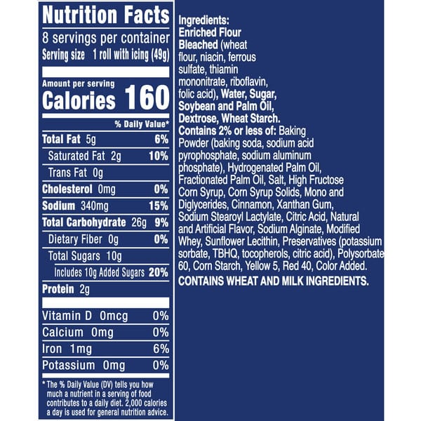 Enriched Flour Bleached (wheat Flour, Niacin, Ferrous Sulfate, Thiamin Mononitrate, Riboflavin, Folic Acid), Water, Sugar, Soybean And Palm Oil, Dextrose. Contains 2% Or Less Of: Baking Powder (baking Soda, Sodium Acid Pyrophosphate, Sodium Aluminum Phosphate), Hydrogenated Palm Oil, Fractionated Palm Oil, Salt, Wheat Starch, High Fructose Corn Syrup, Corn Syrup Solids, Corn Starch, Mono And Diglycerides, Cinnamon, Xanthan Gum, Sodium Stearoyl Lactylate, Citric Acid, Natural And Artificial Flavor, Sodium Alginate, Modified Whey, Sunflower Lecithin, Preservatives (potassium Sorbate, Tbhq, Tocopherols, Citric Acid), Polysorbate 60, Yellow 5, Red 40, Color Added.