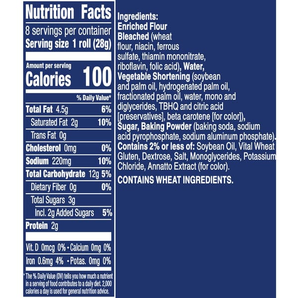 Enriched Flour Bleached (wheat Flour, Niacin, Ferrous Sulfate, Thiamin Mononitrate, Riboflavin, Folic Acid), Water, Vegetable Shortening (soybean And Palm Oil, Hydrogenated Palm Oil, Fractionated Palm Oil, Water, Mono And Diglycerides, Tbhq And Citric Acid [preservatives], Beta Carotene [for Color]), Sugar, Baking Powder (baking Soda, Sodium Acid Pyrophosphate, Sodium Aluminum Phosphate), Contains 2% Or Less Of: Soy Bean Oil, Vital Wheat Gluten, Dextrose, Salt, Monoglycerides, Potassium, Chloride, Annatto Extract (for Color)