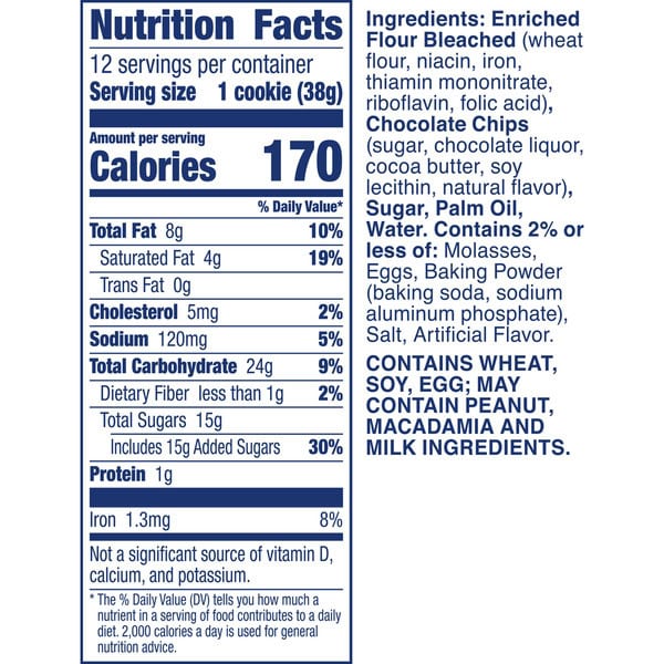 Enriched Flour Bleached (wheat Flour, Niacin, Iron, Thiamin Mononitrate, Riboflavin, Folic Acid), Semisweet Chocolate Chips (sugar, Chocolate Liquor, Cocoa Butter, Soy Lecithin, Vanilla), Sugar, Palm Oil, Water, Canola Oil. Contains 2% Or Less Of: Molasses, Eggs, Salt, Baking Powder (baking Soda, Sodium Aluminum Phosphate), Natural Flavor.