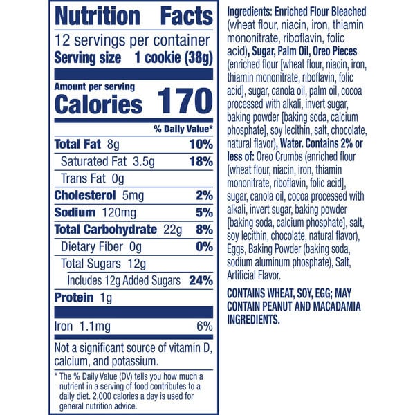 Enriched Flour Bleached (wheat Flour, Niacin, Iron, Thiamin Mononitrate, Riboflavin, Folic Acid), Sugar, Oreo Pieces (enriched Flour [wheat Flour, Niacin, Iron, Thiamin Mononitrate, Riboflavin, Folic Acid], Sugar, Canola Oil, Palm Oil, Cocoa Processed With Alkali, Invert Sugar, Baking Powder [baking Soda, Calcium Phosphate], Soy Lecithin, Salt, Chocolate, Natural Flavor), Palm Oil, Water, Canola Oil. Contains 2% Or Less Of: Oreo Crumbs (enriched Flour [wheat Flour, Niacin, Iron, Thiamin Mononitrate, Riboflavin, Folic Acid], Sugar, Canola Oil, Cocoa Processed With Alkali, Invert Sugar, Baking Powder [baking Soda, Calcium Phosphate], Salt, Soy Lecithin, Chocolate, Natural Flavor), Eggs, Baking Powder (baking Soda, Sodium Aluminum Phosphate), Salt, Natural Flavor.