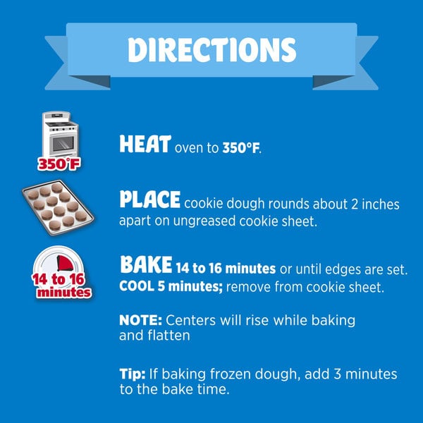 Directions: Heat oven to 350 degrees F. Place cookie dough rounds about 2 inches apart on ungreased cookie sheet. Bake 14 to 16 minutes or until edges are set. Cool 5 minutes; remove from cookie sheet. Note: Centers will rise while baking and flatten when cooling. Tip: If baking from frozen dough, add 3 minutes to the bake time.