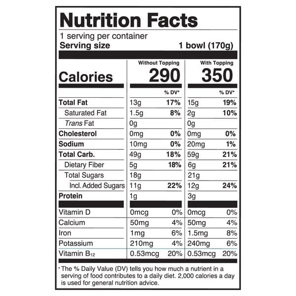 Topping: Whole Grain Oats*, Cane Sugar*, Brown Rice*, Sunflower Oil*, Flax Seeds*, Hemp Seeds*, Sea Salt, Molasses*. *Organic