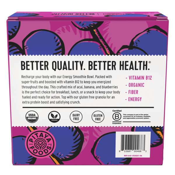 Recharge your body with our Energy Smoothie Bowl. Packed with super-fruits and boosted with vitamin B12 to keep you energized throughout the day. This crafted mix of acai, banana, and blueberries is perfect for breakfast, lunch, or a snack to keep your body fueled and ready for action. Top with our gluten-free granola for an extra protein boost and satisfying crunch.