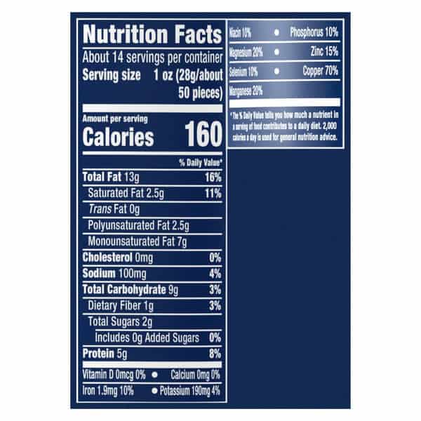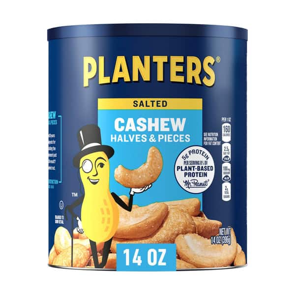 At half the size but with all the classic cashew taste you love, PLANTERS Salted Cashew Halves & Pieces are the ultimate in snack satisfaction. After more than a century of roasting, tweaking, and perfecting salty snacks, the makers of PLANTERS nuts know a thing or two about satisfying your cravings. These impressively creamy cashews are roasted to crunchy precision in peanut oil then seasoned with sea salt to create the savory flavor you know and love. A classic snack at parties, family game nights, and holiday get-togethers, these seasoned cashews are also delicious as snacks for road trips, lunch boxes, picnics, hikes or even at the office. Each 1oz Kosher serving of salted cashew halves contains 5 grams of plant-based protein and 160 calories to help curb your hunger and keep you going between meals. They come in a convenient 14 oz airtight container with a resealable lid to keep them fresh and flavorful. All trademarks, logos and images are owned by Hormel Foods Corporation, its subsidiaries and affiliates. Copyright Hormel Foods, LLC