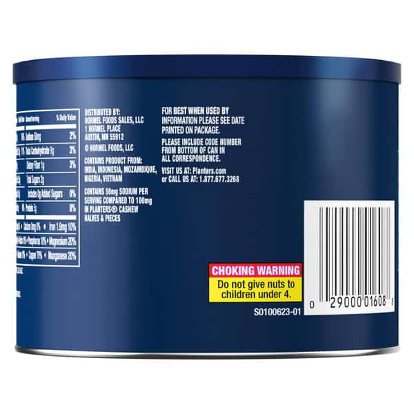 At half the size but with all the classic cashew taste you love, PLANTERS Lightly Salted Cashew Halves & Pieces are the ultimate in snack satisfaction with 50% less salt then regular PLANTERS Cashews. After more than a century of roasting, tweaking, and perfecting salty snacks, the makers of PLANTERS nuts know a thing or two about satisfying your cravings. These impressively creamy cashews are roasted to crunchy precision in peanut oil then seasoned with sea salt to create the savory flavor you know and love. A classic snack at parties, family game nights, and holiday get-togethers, these seasoned cashews are also delicious as snacks for road trips, lunch boxes, picnics, hikes or even at the office. Each 1oz Kosher serving of salted cashew halves contains 5 grams of plant-based protein and 160 calories to help curb your hunger and keep you going between meals. They come in a convenient 8 oz airtight container with a resealable lid to keep them fresh and flavorful. All trademarks, logos and images are owned by Hormel Foods Corporation, its subsidiaries and affiliates. Copyright Hormel Foods, LLC