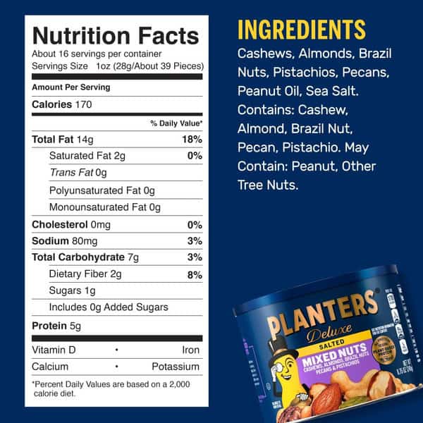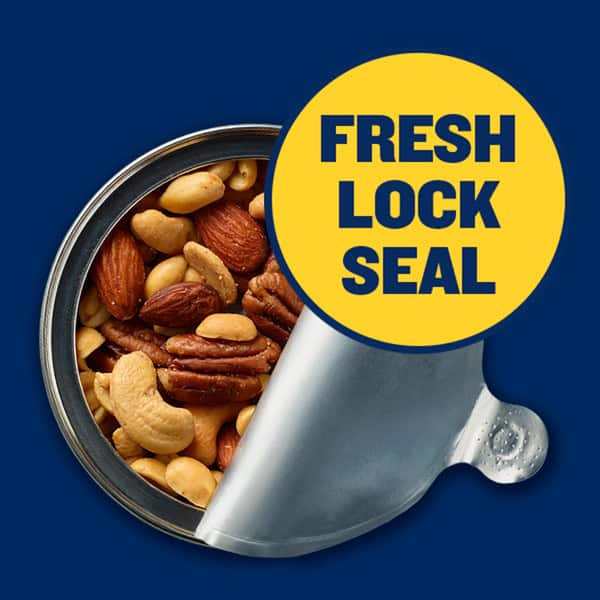 PLANTERS Deluxe Mixed Nuts With Brazil nuts is a tasty assortment of roasted nuts, including cashews, almonds, Brazil nuts, pistachios and pecans. The slightly sweet Brazil nuts add satisfying buttery flavor to the can of mixed nuts. Roasted to crispy perfection in peanut oil and seasoned with sea salt, these mixed nuts have a hearty taste and a crunchy texture, making them a savory snack that everyone in the family is sure to enjoy. These nutritious roasted mixed nuts with no peanuts contain 170 calories per 1 ounce serving, which means they help ward off hunger and are great to take along on road trips or for munching during movie night. The roasted mixed nuts are Kosher-approved and come in an airtight can with a resealable lid to ensure freshness. Pop open a 8.75 ounce canister of mixed nuts and enjoy this flavorful crunchy treat. All trademarks, logos and images are owned by Hormel Foods Corporation, its subsidiaries and affiliates. Copyright Hormel Foods, LLC.