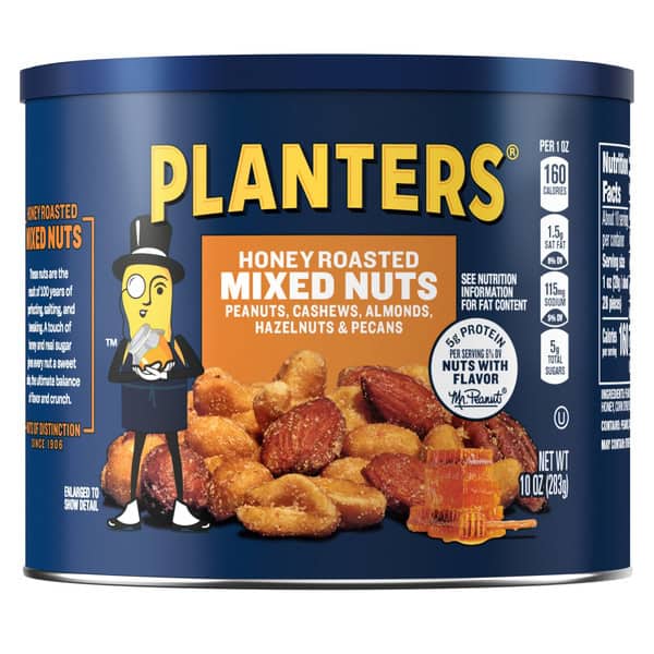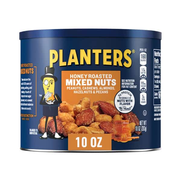 PLANTERS Deluxe Honey Roasted Mixed Nuts have all your cravings covered with a satisfying combination of sweet and salty flavors. For more than 100 years, the makers of PLANTERS nuts have been bringing people together with irresistibly crunchy snacks for any occasion. These premium honey roasted mixed nuts keep that tradition alive by bringing together the sweetness of honey and the rich roasted flavor of peanuts, cashews, almonds, hazelnuts and pecans. Crave better with cholesterol-free, 0g trans fat per serving, Kosher mixed nuts that deliver the ultimate balance of sweet and salty. They help curb your hunger until mealtime while indulging your need for a special afternoon treat. Packaged in a convenient 10 oz resealable, airtight container, these deliciously flavored seasoned mixed nuts are ready for entertaining at cocktail parties and game nights, or to serve as satisfying snacks for road trips and in lunch boxes. All trademarks, logos and images are owned by Hormel Foods Corporation, its subsidiaries and affiliates. Copyright Hormel Foods, LLC