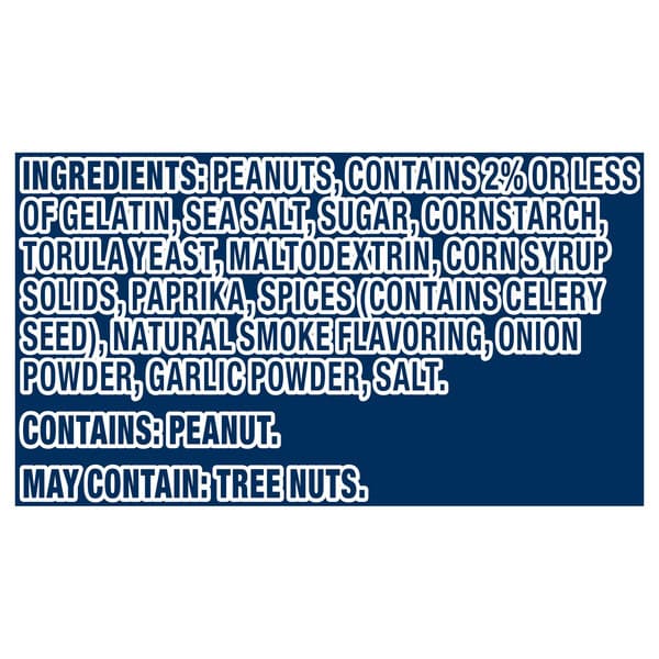 Peanuts, Contains 2% Or Less Of Sea Salt, Spices (contains Celery), Dried Onion, Dried Garlic, Paprika, Natural Flavor Sugar, Cornstarch, Gelatin, Torula Yeast, Maltodextrin, Dried Corn Syrup.