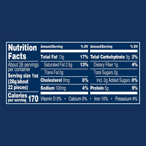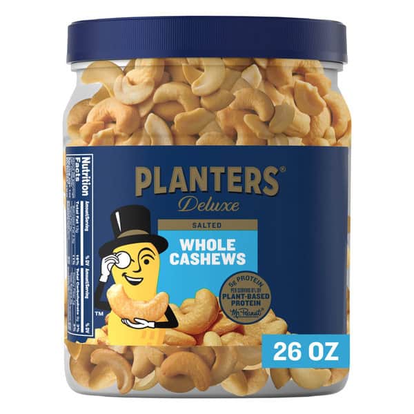 PLANTERS Fancy Whole Cashews with Sea Salt are a flavor-packed crunchy snack that leaves you feeling satisfied. The rich jumbo-size cashews are roasted in peanut oil and deliciously seasoned with sea salt, creating a go-to snack that you crave. Packed in a convenient plastic container with a twist-off lid, these fancy nuts stay fresh. The Kosher cashews have 160 calories and 5 grams of protein per 1 ounce serving, so they help to fuel you until dinnertime and help you relax after a long day. Shake these party nuts into a snack bowl and serve them when friends come over, or put the 26 ounce container of cashews in any easy-to-reach place where you can grab the roasted nuts and enjoy a quick handful. All trademarks, logos and images are owned by Hormel Foods Corporation, its subsidiaries and affiliates. Copyright Hormel Foods, LLC.