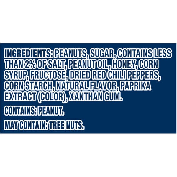 Peanuts, Sugar, Contains Less Than 2% Of Salt, Peanut Oil, Honey, Corn Syrup, Fructose, Dried Red Chili Peppers, Corn Starch, Natural Flavor, Paprika Extract (color), Xanthan Gum