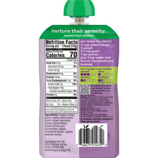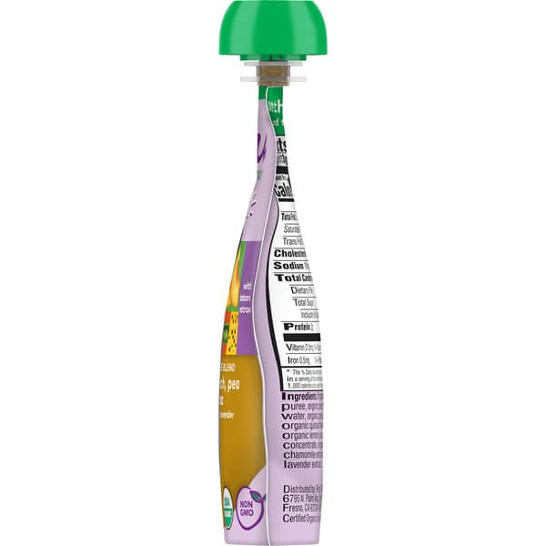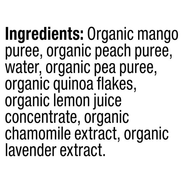 Organic Mango Puree, Organic Peach Puree, Water, Organic Pea Puree, Organic Quinoa Flakes, Organic Lemon Juice Concentrate, Organic Chamomile Extract, Organic Lavender Extract.
