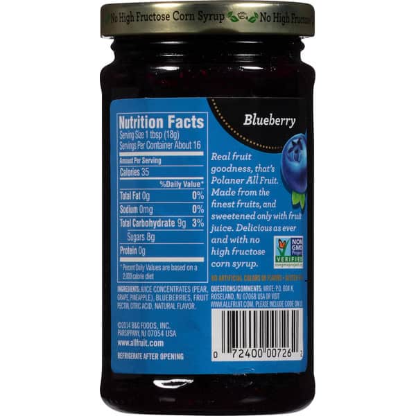 Polaner All Fruit Blueberry Spreadable Fruit is a fruit spread with flavor and quality worthy of sharing across generations. Polaner fruit spread is proudly manufactured in the USA with only the finest real fruits. Sweetened only with fruit juice, Polaner All Fruit Blueberry provides an irresistible sweetness and satisfying texture that is unmatched by blueberry jam, blueberry preserves or blueberry jelly. Non GMO verified, this gluten free blueberry fruit spread is made with no high fructose corn syrup, has no cane sugar added and contains 35 calories per serving. You can confidently enjoy the tradition and taste of Polaner All Fruit blueberry fruit spread whether you smear it on your morning bagel, slather it on a lunchtime PB&J sandwich or use it as the base of a sweet glaze. This jar of Polaner All Fruit Spreadable Fruit Blueberry is easy to open and should be stored in the refrigerator until you are ready to bake, cook or grill up some delicious recipes with real fruit flavor. Since 1898, American families have passed Polaner fruit spread to one generation after another. The reason is simple – quality ingredients and all fruit flavor.