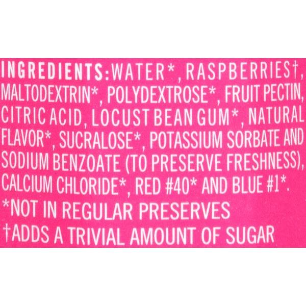 Water*, Raspberries+, Maltodextrin*, Polydextrose*, Fruit Pectin, Citric Acid, Locust Bean Gum*, Natural Flavor*, Sucralose*, Potassium Sorbate And Sodium Benzoate (to Preserve Freshness), Calcium Chloride*, Red #40* And Blue #1*.