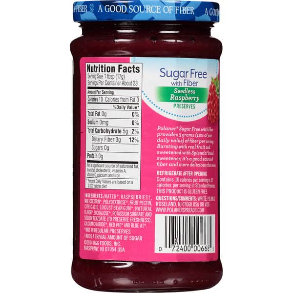 This Polaner Sugar Free with Fiber Seedless Raspberry Preserves is a delicious addition to sandwiches, toast, muffins or croissants. It is made from real fruit for a bold flavor you will love and that will liven up any meal. Polaner with fiber also contains 80 percent fewer calories than standard preserves and is packed with dietary fiber sourced from maltodextrin. Inside you will find 13.5 oz of sugar free, Splenda sweetened product packaged in a convenient resealable jar that helps to preserve the fresh taste you want.