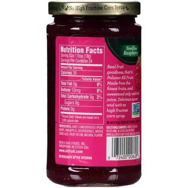 Polaner All Fruit Seedless Raspberry Spreadable Fruit is a fruit spread with flavor and quality worthy of sharing across generations. Polaner fruit spread is proudly manufactured in the USA with only the finest real fruits. Sweetened only with fruit juice, Polaner All Fruit Raspberry Spreadable Fruit provides an irresistible sweetness that is unmatched by raspberry jam, raspberry preserves or raspberry jelly. The lack of seeds keeps Polaner spreadable fruit velvety smooth for all of the flavor of Polaner fruit with none of the seeds. Non GMO verified, this gluten free raspberry fruit spread is made with no high fructose corn syrup, has no cane sugar added and contains 35 calories per serving. You can confidently enjoy the tradition and taste of Polaner All Fruit Raspberry Fruit Spread whether you smear it on your morning bagel, slather it on a lunchtime PB&J sandwich or use it as the base of a sweet glaze. This jar of Polaner All Fruit Raspberry Spreadable Fruit is easy to open and should be stored in the refrigerator until you are ready to bake, cook or grill up some delicious recipes with real fruit flavor. Since 1898, American families have passed Polaner fruit spread to one generation after another. The reason is simple – quality ingredients and all fruit flavor.