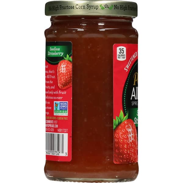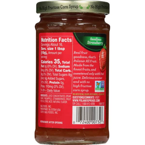 Fresh strawberries have never been more velvety smooth. The lack of seeds make it the ideal spread for extra creamy PB&Js or the base for a delicious glaze to top luscious lemon bundt cakes. Polaner All Fruit Seedless Strawberry Spreadable Fruit is a fruit spread with flavor and quality worthy of sharing across generations. Polaner fruit spread is proudly manufactured in the USA with only the finest real fruits. Sweetened only with fruit juice, Polaner All Fruit Strawberry Spreadable Fruit provides an irresistible sweetness that is unmatched by strawberry jam, strawberry preserves or strawberry jelly. Non GMO verified, this gluten free strawberry fruit spread is made with no high fructose corn syrup, has no cane sugar added and contains 35 calories per serving. You can confidently enjoy the tradition and taste of Polaner All Fruit Strawberry Fruit Spread whether you smear it on your morning bagel, slather it on a lunchtime PB&J sandwich or use it as the base of a sweet glaze. This jar of Polaner All Fruit Strawberry Spreadable Fruit is easy to open and should be stored in the refrigerator until you are ready to bake, cook or grill up some delicious recipes with real fruit flavor. Since 1898, American families have passed Polaner fruit spread to one generation after another. The reason is simple – quality ingredients and all fruit flavor.