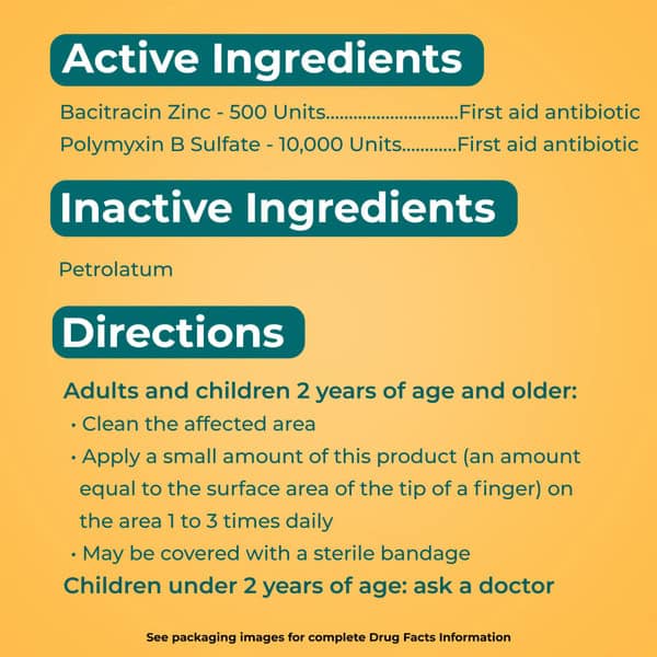 Help prevent infection in minor cuts, scrapes and burns with Polysporin First Aid Antibiotic Ointment. This topical skin ointment combines the power of the antibiotic ingredients bacitracin zinc (500 units/gm) with polymyxin B sulfate (10,000 units/gm) for first aid antibiotic power that is neomycin-free. Polysporin First Aid Antibiotic Ointment is the #1 dermatologist-recommended first aid ointment for infection protection. Simply apply a small amount of wound care ointment on the affected area one to three times a day, cover with a sterile bandage and enjoy infection protection. This ointment makes a great addition to a first aid kit or wound care supplies.