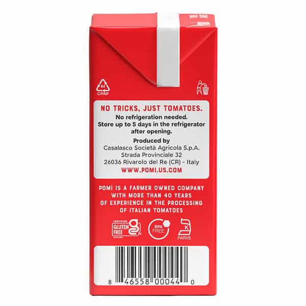 Made with bold and bright red Italian tomatoes that are famous for their distinct aroma and flavor. A favorite of many, for its rich tangy flavor and exceptionally chunky consistency. Pomì chopped tomatoes (Pomì Polpa di Pomodoro) is a sauce produced only with Italian organic tomatoes, which are healthy, fresh and perfectly ripe, processed immediately after harvesting. Excellent for pizza margherita or pasta and to enhance the flavor of every fish-based dish. Store up to 5 days in the fridge after opening.